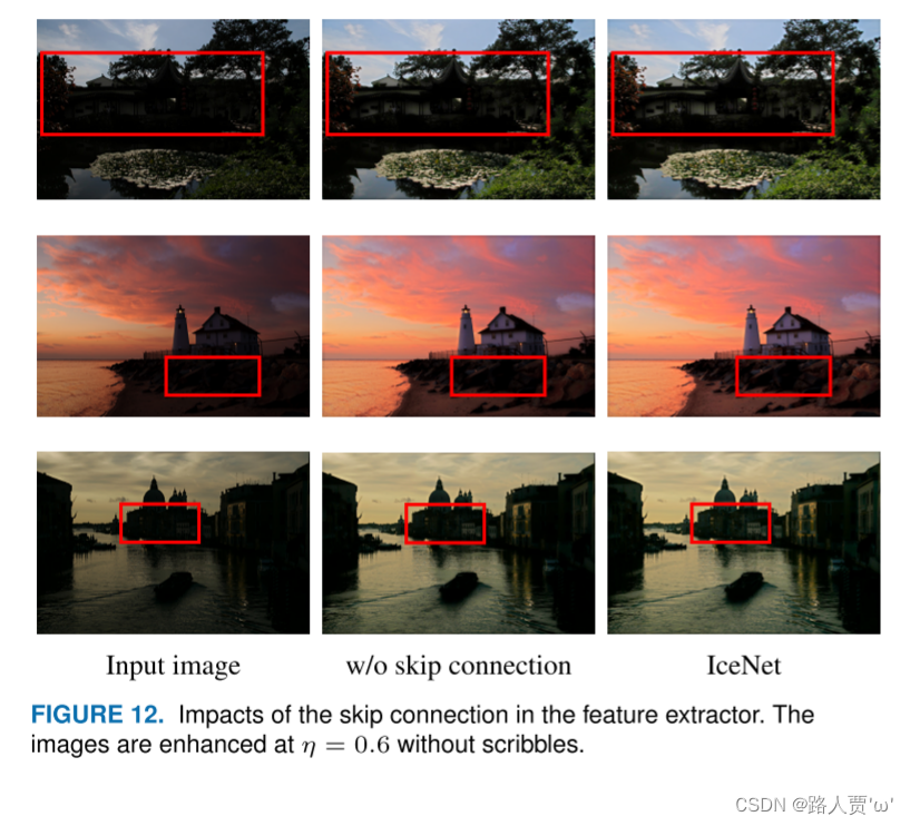 图11比较了所提出的IceNet与不同参数设置的结果。在这个测试中,我们改变了卷积层和输出通道的数量。请注意,所提出的 IceNet 的默认设置采用 7 个卷积层和 32 个输出通道。如图11所示,当参数量小于默认设置时,输出图像会过度增强。另一方面,当参数量大于默认设置时,输出图像与默认设置的图像相似。这表明默认设置既有效又高效。
