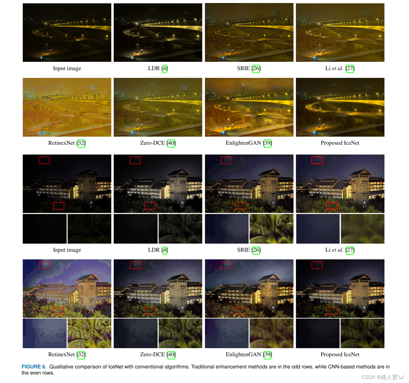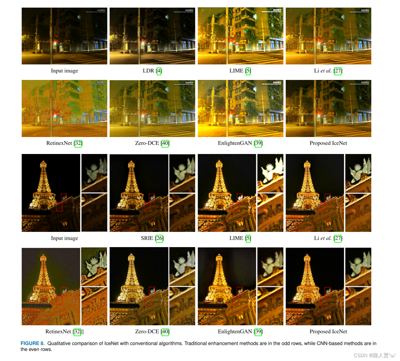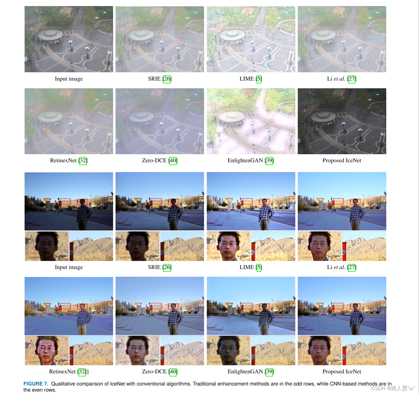 图6,7,8.IceNet与传统算法的定性比较。传统的增强方法在奇数行,而基于cnn的增强方法在偶数行。