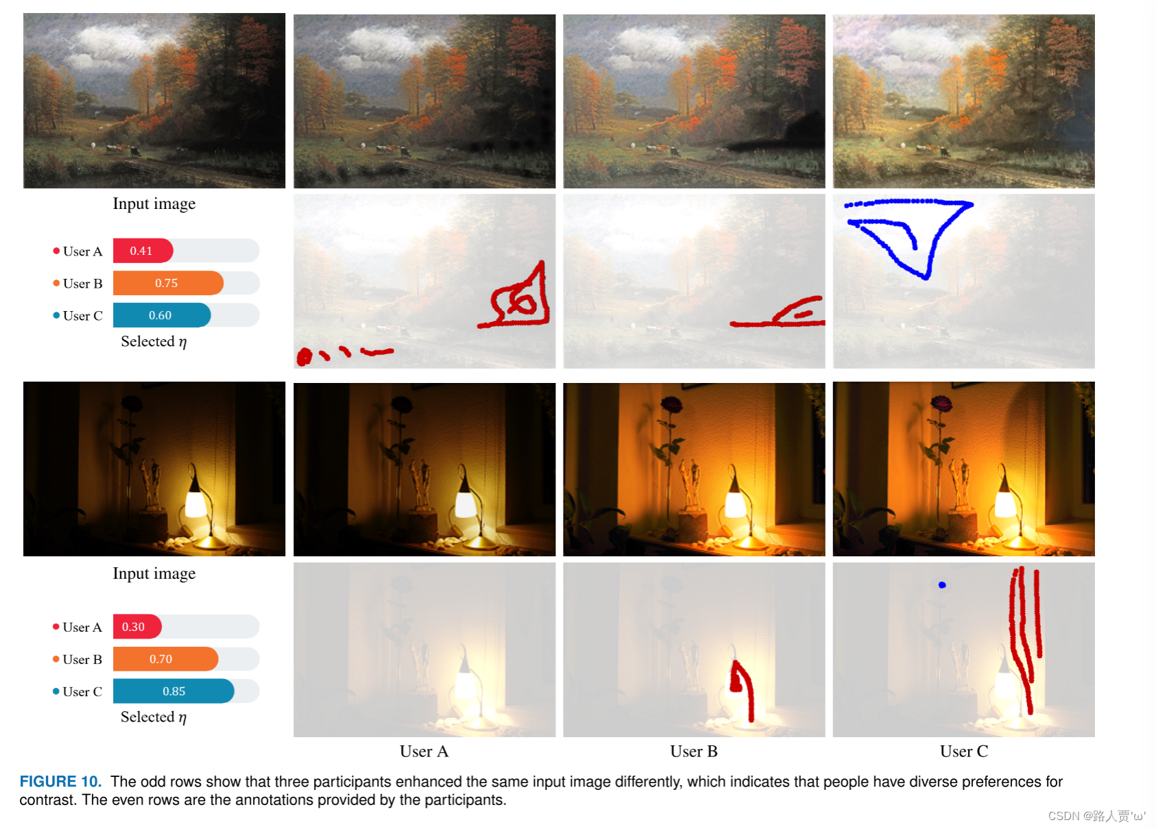 在图10中,奇数行显示了三个参与者如何在用户研究期间以不同方式增强相同的输入图像,偶数行显示参与者提供了各种注释以获得满意的图像。通过增强图像我们看到人们对对比度有不同的偏好。所提出的交互算法可用于自适应地满足这些偏好。