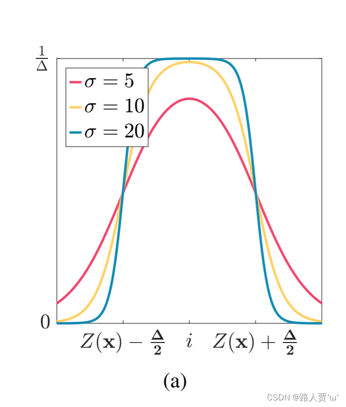对于软直方图,我们使用[47]中的映射函数表示像素 x 对第 i 个 bin 的贡献,由下式给出:公式(11) 其中 (·) 是 sigmoid 函数,Δ = 1 是 bin 宽度,σ 是坡。图 4(a) 显示了 σ = 5、10 或 20 时的软映射函数。请注意,σ 控制映射函数的宽度和高度之间的权衡。随着 σ 的增加,映射函数变得更窄但更高。在这项工作中,我们设置 σ = 10。接下来,我们通过对所有像素的贡献求和来制作软直方图 h,公式(12) 然后,我们将 Lent 定义为由 公式(13)