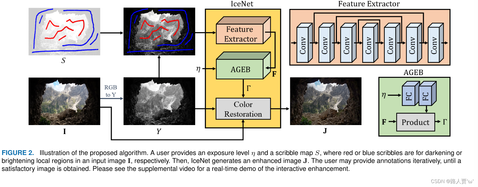 摘要 本文提出了一种基于 CNN 的交互式对比度增强算法,称为 IceNet,该算法使用户能够根据自己的喜好轻松调整图像对比度。具体来说,用户提供用于控制全局亮度的参数和两种类型的涂鸦来使图像中的局部区域变暗或变亮。然后,根据这些注释,IceNet 估计用于逐像素伽玛校正的伽玛图。最后,通过色彩恢复,得到增强后的图像。用户可以迭代地提供注释以获得满意的图像。 IceNet还能够自动生成个性化的增强图像,如果需要的话可以作为进一步调整的基础。此外,为了有效、可靠地训练 IceNet,我们提出了三种可微损失。大量的实验表明,IceNet 可以为用户提供令人满意的增强图像。