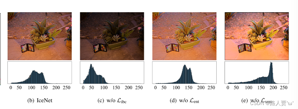 总损失被定义为三个损失的加权和,由 公式 (15) 给出,其中 gone 和 wsmo 是权重。因此,所提出的 IceNet 经过训练以最小化三个损失函数。首先,Libc 使 IceNet 能够控制全局和局部亮度。其次,四旬斋鼓励平坦的直方图,这可以增加全局对比度。第三,Lsmo 平滑伽玛图。图 4(b)∼(e) 说明了每种损失的功效,这将在第 IV-B4 节中讨论。