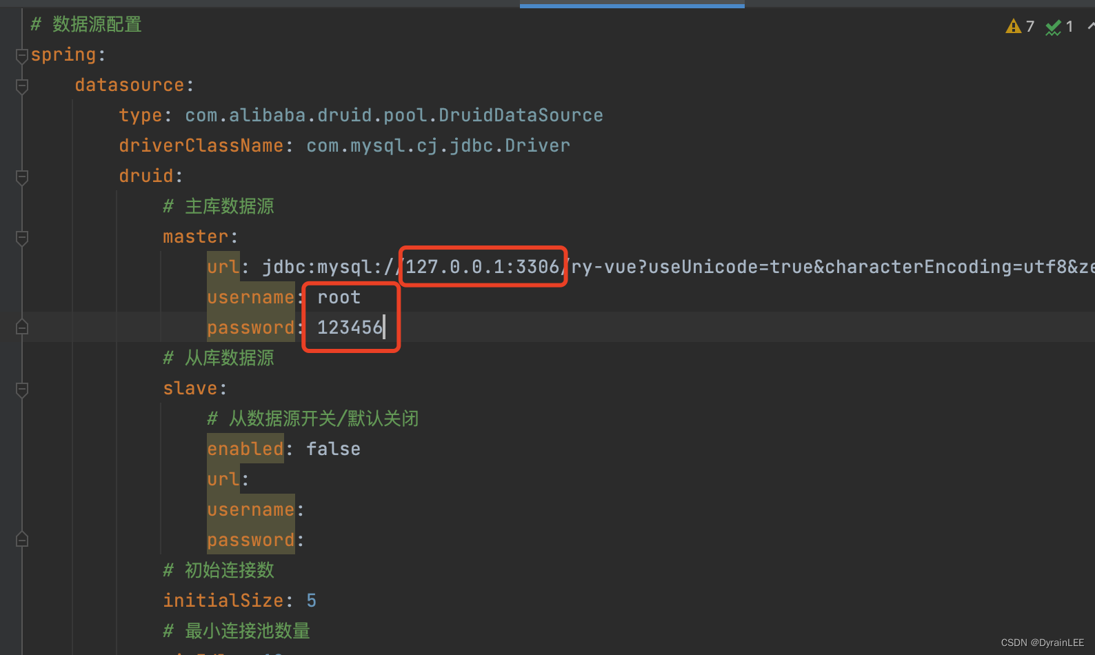 - 编辑项目配置文件 application-druid.yml 中的数据库相关信息