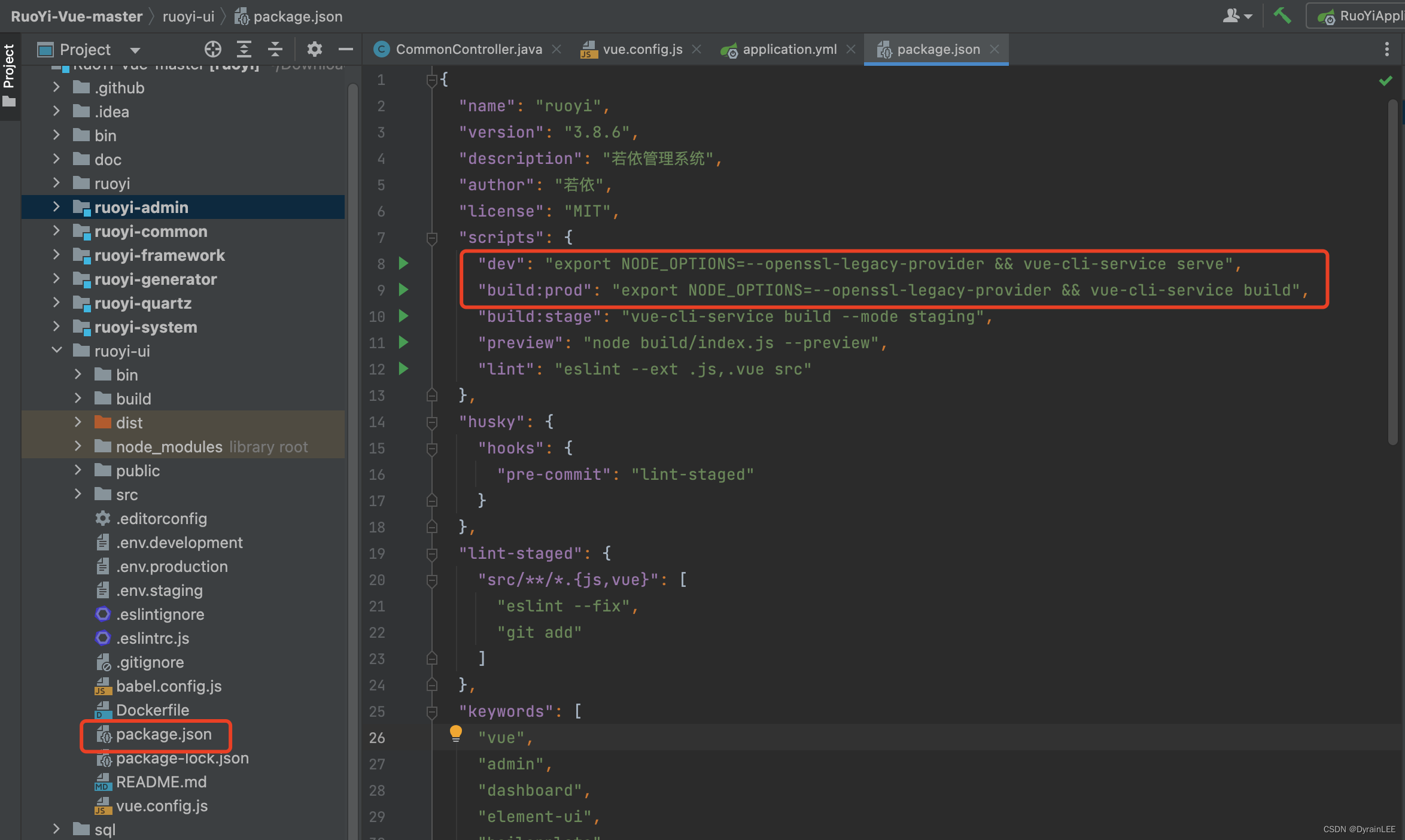 - 由于我下载的node版本较高,加载若依项目时会报错,相关资料可自行查询,此处直接放解决方法,在 package.json 里的对应位置添加下列语句