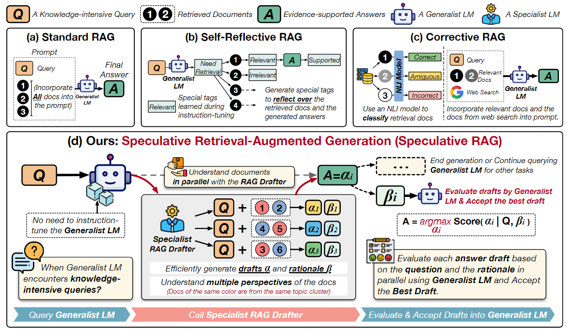 图 1:不同 RAG 方法的说明。给定一个知识密集型查询 Q 和检索到的文档,(a) 标准 RAG 将所有文档都纳入提示,从而增加了输入长度并减慢了推理速度;(b) Self-Reflective RAG(Asai 等人,2023 年)需要对通用语言模型(LM)进行专门的指令调整,以生成用于自反思的特定 token;© Corrective RAG(Yan 等人,2024 年)采用外部检索评估器来改进文档质量,只关注上下文信息,而不增强推理能力;(d) 相比之下,SPECULATIVE RAG 利用较大的通用 LM 来有效验证由较小的专用 LM 并行生成的多个 RAG 草案。每个草案都是从检索到的文档的一个不同子集生成的,从而为证据提供了不同的视角,同时最大限度地减少了每个草案的输入 tokens。