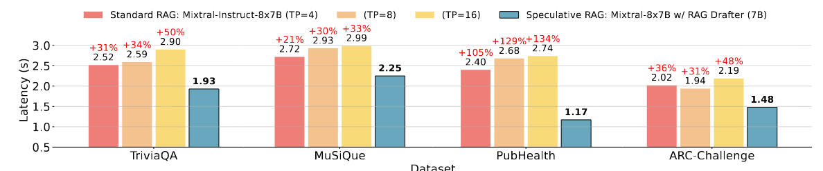图 2:标准 RAG 和 SPECULATIVE RAG 的延迟差异以红色标出(+x%)。TP 表示标准 RAG 运行 Mixtral-Instruct 8x7B 时的张量并行大小。由于检索文档的长度不同,不同数据集的延迟也不同。