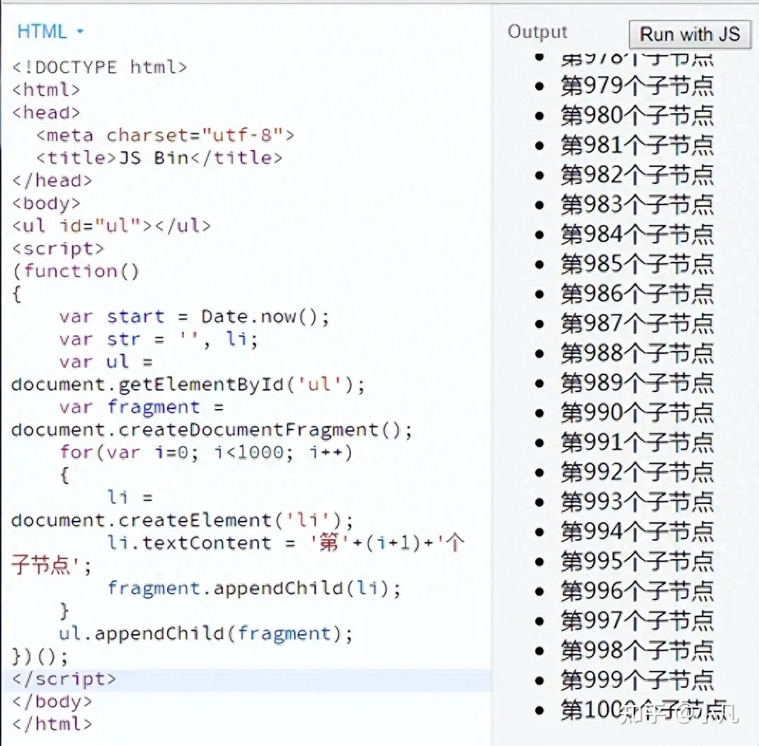 DocumentFragments 是DOM节点。它们不是主DOM树的一部分。通常的用例是创建文档片段,将元素附加到文档片段,然后将文档片段附加到DOM树。在DOM树中,文档片段被其所有的子元素所代替。因为文档片段存在于内存中,并不在DOM树中,所以将子元素插入到文档片段时不会引起页面回流(reflow)(对元素位置和几何上的计算)。因此,使用文档片段document fragments 通常会起到优化性能的作用。