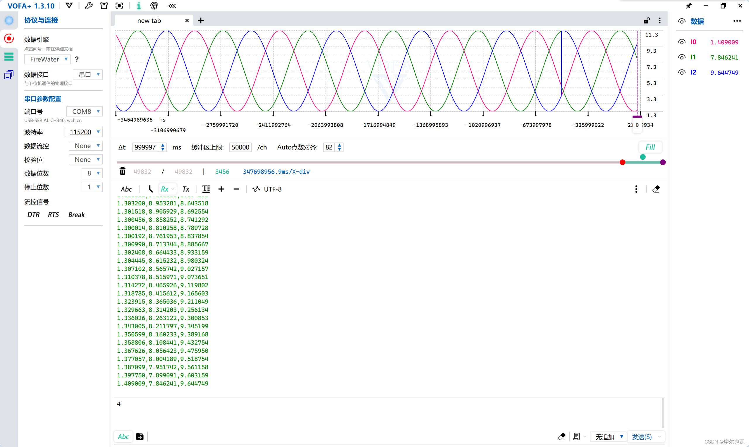 我们打开vofa就可以得到这样的三条相位相差120度的正弦波
