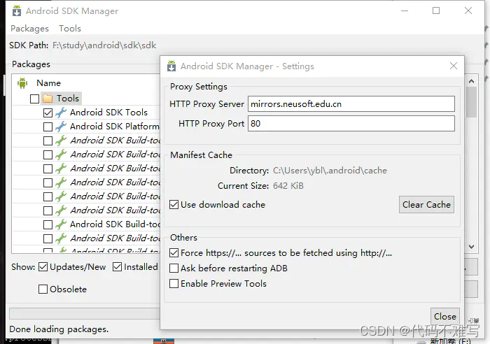 安装好后打开安装目录的 SDK Manager.exe,点击 Tools >> options