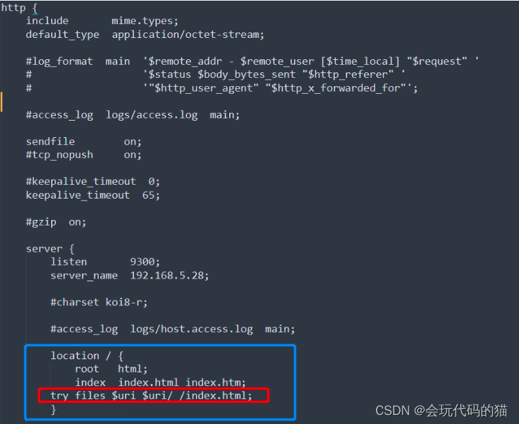 try_files 更加可靠, 首先会查找"$uri"下的这个文件,如果不存在会查找$uri/,如果还不存在就会重定向到 /index.html页面。如果最后参数写错了,就会导致500的服务器错误。