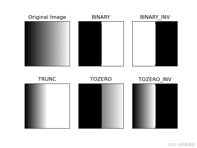 这五种简单阈值化方法的主要区别在于如何处理像素值,并根据设定的阈值(在你的例子中是127)将其分类。以下是每种方法的具体说明: