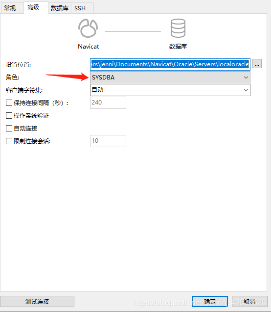 打开编辑连接,主机行就写入上面host=后面的名称,端口也是在上述说的文件可以查到,然后点击高级,将里面的“角色”选择为SYSDBA,然后测试连接,就连接成功。