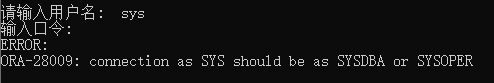 使用SQL Plus连接时,因为正常输入用户名的口令,用户名为sys会报错报错如下,跟navicat一样,原因是SYS是在数据库之外的超级管理员。