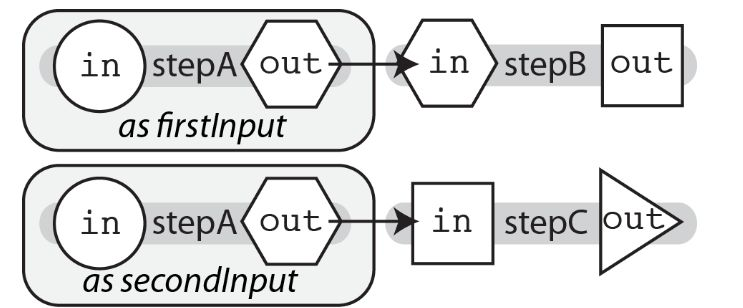 call stepC { input: in1=stepB.out1, in2=stepB.out2 }