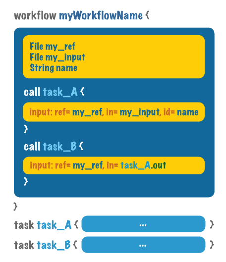 每个脚本包含1个workflow, workflow由多个task构成。 在workflow中,通过call调用对应的task。每个task在workflow代码块之外单独定义。