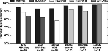 从图中可以看到,不论是基因组的数据,还是转录组的数据,opitype提供的4位分型结果的准确率都高于HLAminer和HLAforest。