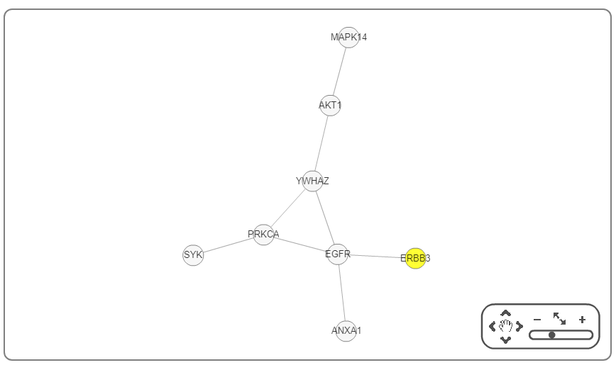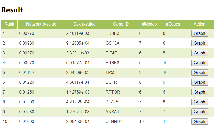 该算法是在整个网络中搜索与患者的生存状态相关的子网subnetwork, 结果按照p值进行排序,点击Graph按钮可以查看子网的结果,示意如下