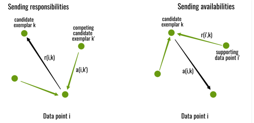 2. availability,归属度,对于(i, k)而言,定量描述样本i支持样本k作为其聚类中心的程度