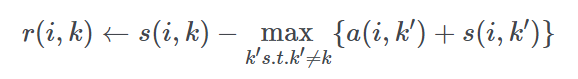AP算法通过迭代的方式来达到聚类效果,每次迭代其实就是更新上述两个矩阵的值, 在更新的时候,引入了一个叫做dumping factor的参数来控制更新的幅度,公式如下