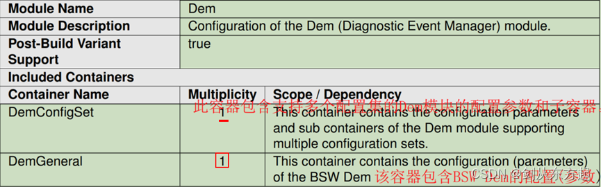 本文详细介绍了AUTOSAR中的Dem(Diagnostic Event Manager)配置,包括DemGeneral和DemConfigSet两大模块,涵盖了各种配置参数、回调函数、数据元素、冻结帧记录等方面,旨在帮助读者理解Dem在故障管理和存储中的关键作用及配置方法。