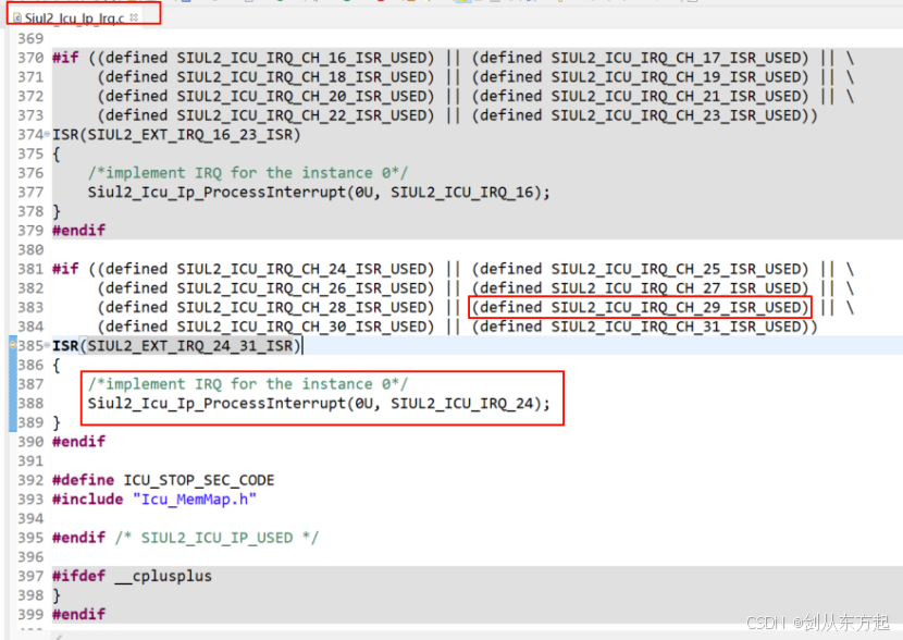 SIUL2_EXT_IRQ_24_31_ISR来源需要在如下.c里面,注意一下,所有的RTD配置中断的时候,均为在对应的Irq.c中寻找句柄函数,这个在之前的文章中有提到过。
