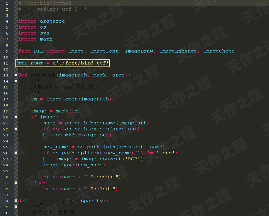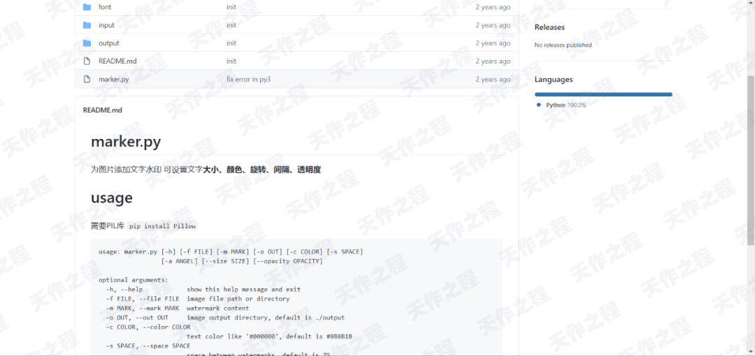 python marker.py -f ./input -m 天作之程 -c#232862 --opacity 0.05