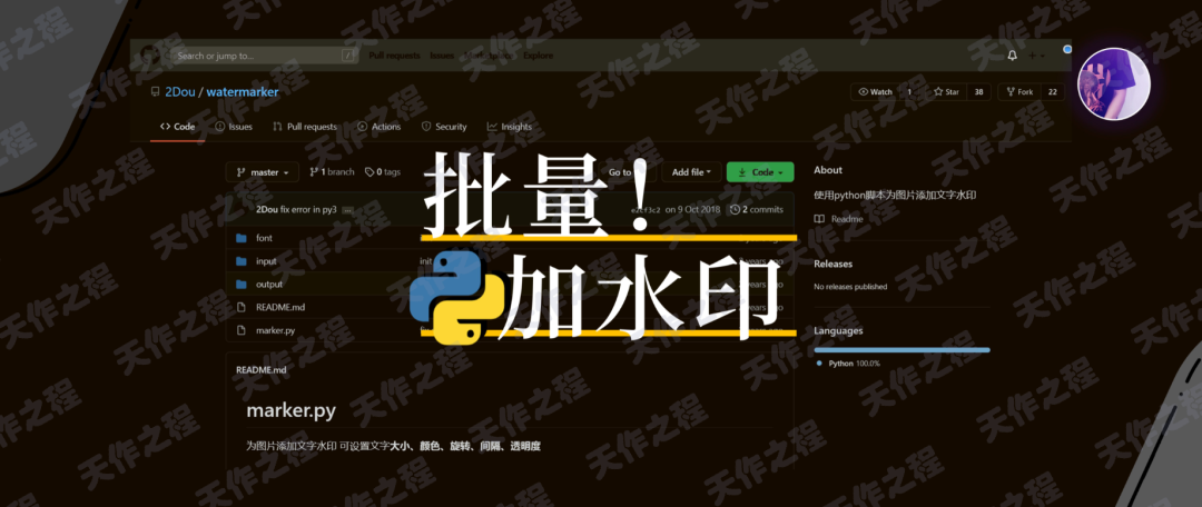 今天就来带大家,用Python给图片批量加上水印。有的小伙伴可能会说,网上也有很多工具有类似的功能,何必重复造轮子,被我猜到了吧。