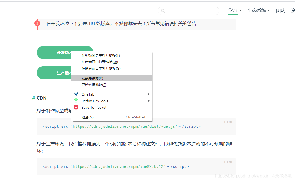 进入官网:https://cn.vuejs.org/v2/guide/installation.html,右键点击你需要的版本链接另存为