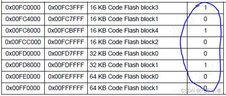 Flash分为不同的Partion,主要是0 Partion和1 Partion,且0 Partion和1 Partion在整个物理地址中是交互存在的,如下图。所以你的Code既会存在0 Partion中又会存在1 Partion中。但是当你要去擦Flash的时候,如果你的Code完全存在0 partion中,是可以擦1 partion的;反之依然。但一般不是这么存放的,即Code既会存在0 Partion又会存在1 Partion中。所以,当你想去擦Flash的时候,是不可以直接去擦的,目前常规的做法是将Code拷贝到Ram中运行。方法如下: