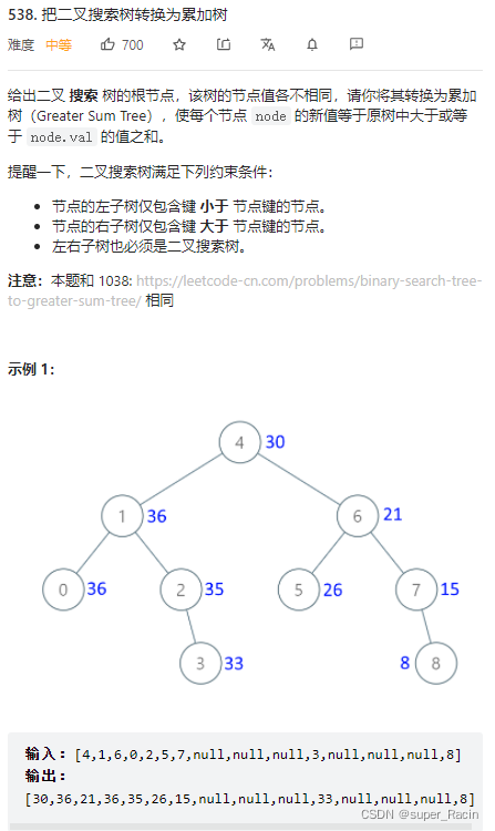 从示例可以看出求和信息是从右往左的,再分析一下,能满足这种的只有中序遍历,应为中序遍历是当遍历到当前节点时,已经保存了当前节点的右孩子的所有信息,本题中也就是能够记录下右孩子的和,所以本质上还是一个中序遍历,只不过是从右子树开始。