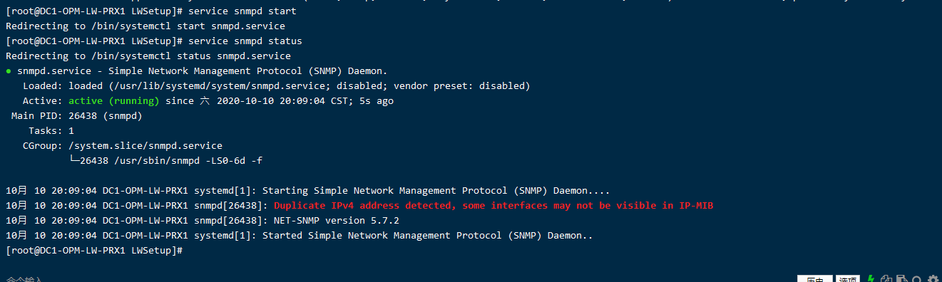 三、查看snmp.service状态的时候出现了这样一行刺眼的红字:Duplicate IPv4 address detected, some interfaces may not be visible in IP-MIB。我理解的意思就是该设备用的IPv4地址冲突了,但是排查了一下我ens192的IP地址发现该IP并没有与其他设备冲突,唯一可能冲突的IP地址就是virbr0上的192.168.122.1了,因为我每台设备上都有一个这样的网卡地址。