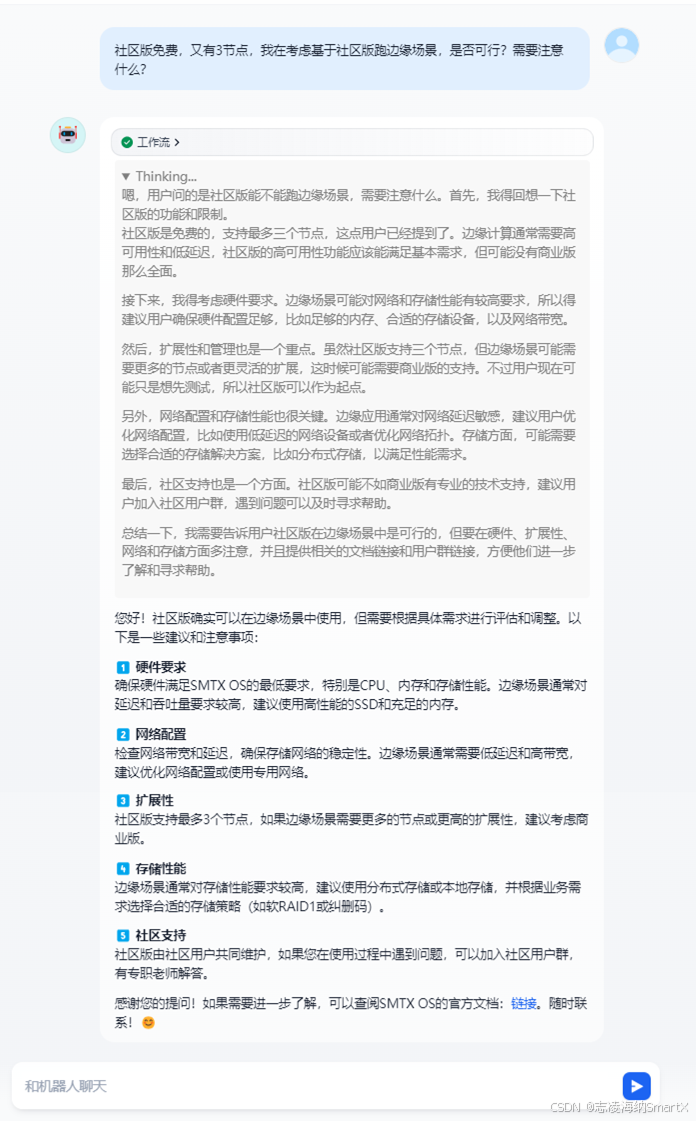 可以看到,32B 模型在输出质量上有所提升,但平均回复时间与 14B 模型持平。整体而言,以 SmartX AI 基础设施部署 Dify 支持 DeepSeek-R1-32B 模型,结合人工优化,可以满足 AI 客服场景的基本使用需求。后续,可通过知识库、工作流等方面的优化,进一步提升回复效率和质量。