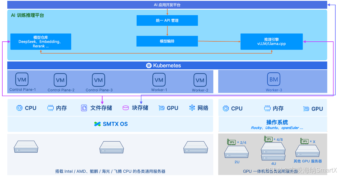 - 双重环境支持:模型编排、仓库和 AI 应用等不依赖 GPU 资源的组件,可以部署在虚拟机中的 Kubernetes Worker 节点上,提升资源利用率。