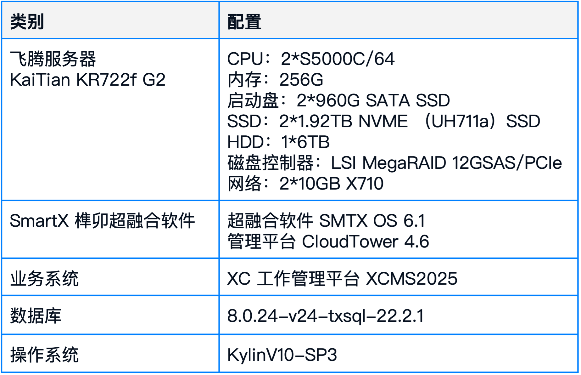 使用内部系统“XC 工作管理平台”,结合银河麒麟操作系统、TDSQL,验证业务在基于飞腾 S5000C 的 SmartX 超融合平台中运行的性能与稳定性。