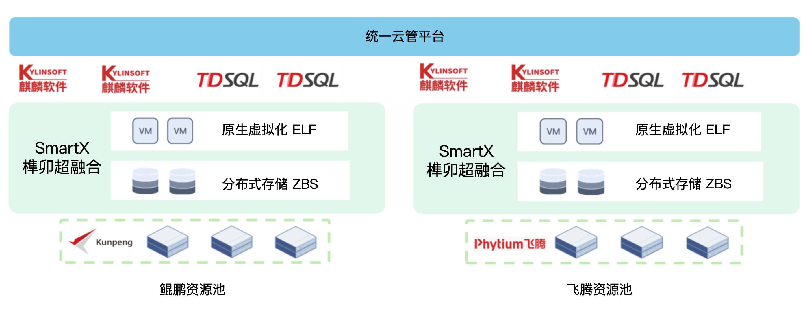 近期,申万宏源证券有限公司(以下简称“申万宏源证券”)与北京志凌海纳科技股份有限公司(以下简称“SmartX”)开展了基于“鹏腾”双芯双栈统一云资源池的适配与性能优化课题探索,完成了飞腾 S5000C 芯片与 SmartX 榫卯超融合(原 SmartX HCI)软件及主流操作系统、数据库的适配及优化,并分别利用跨集群迁移、OVF 导出导入技术以及 SmartX 的 V2V 迁移工具 – SMTX 迁移工具和 P2V 迁移工具 – SMTX CloudMove,实现业务系统在飞腾 S5000C 与鲲鹏 920 集群之间的迁移。
