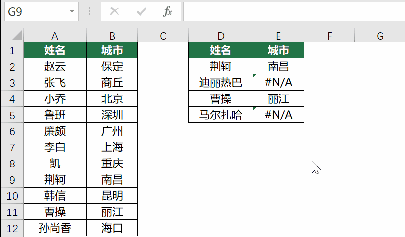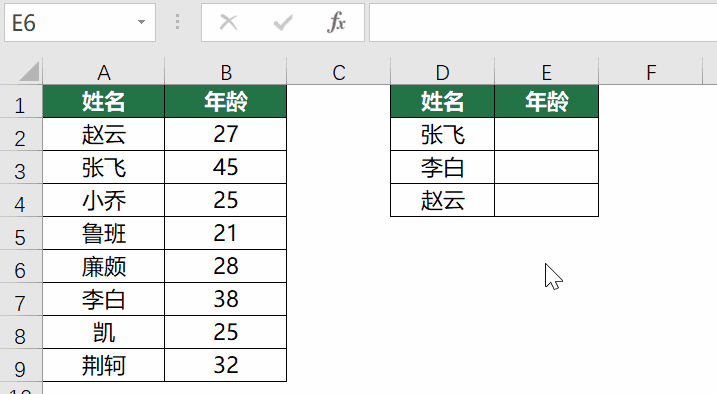 在E2单元格内输入公式=VLOOKUP(D2,A2:B9,2,0),由于参数2未采用绝对引用,公式在下拉到“赵云”的时候,引用区域变成了“A4:B11”,区域内并无此人,当然查找不到数据。