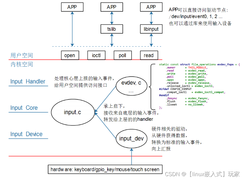 Linux嵌入式input子系统 code表示哪一个事件,EV_KEY(按键)类事件,它表示键盘。其中type表示哪类事件,比如EV_REL表示相对位移(比如鼠标),EV_ABS表示绝对位置(比如触摸屏)对于按键,它的value可以是0(表示按键被按下)、1(表示按键被松开)、2(表示长按);对于触摸屏,它提供的是绝对位置信息,有X方向、Y方向,还有压力值。设备驱动使用内核提供的接口,向内核上报输入事件,内核处理输入事件并且给用户层提供接口。1.内核用input_dev结构体表示一个输入设备(鼠标,键盘,触摸屏).value:表示事件值。