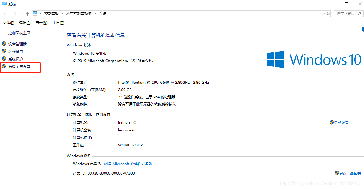 在桌面上选择我的电脑按鼠标右键,选择属性,进入系统界面,选择高级系统设置