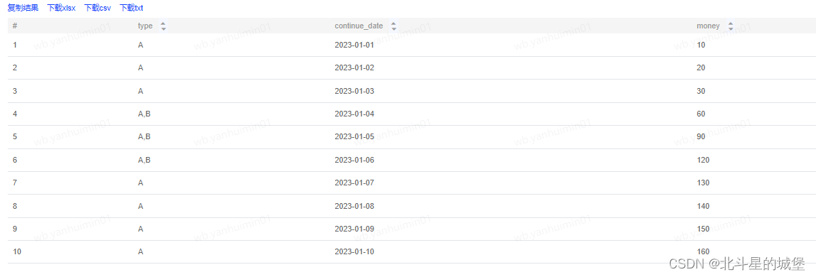 hive的space和posexplode函数 小李投了A和B两种类型的股票,收益为天,需求:计算小李截止到每日的累计收益。space函数:例:产生长度为5的空字符串。投资类型 开始时间 结束时间 每日收益。投资类型 日期 累计收益。