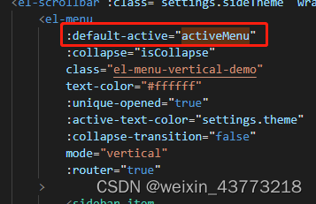 el-menu在一级导航跳转其他页面后,一级导航保持高亮 代码实现:主要思路是,在写路由的时候,给跳转的路由在meta中加上activeMenu,这activeMenu即一级导航需要保持高亮的路由地址,然后在el-menu组件中添加default-active,即如果跳转的路由有activeMenu的话,就让这activeMenu保持高亮,如果没有则让跳转的页面高亮。先上效果图,在只有一级导航的情况下,跳转到其他页面的时候,一级导航保持高亮。