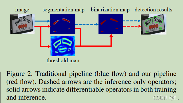 红线——与传统方法区别在于阈值选取方面,通过网络预测每一个位置处的阈值,而不是采用一个固定的值,可以很多的将背景和前景分离出来,但是这样的操作会遇到一个问题:给训练带来了梯度不可微的情况,因此,对于此二值化提出了Differentiable Binarization (DB)来解决不可谓的问题。