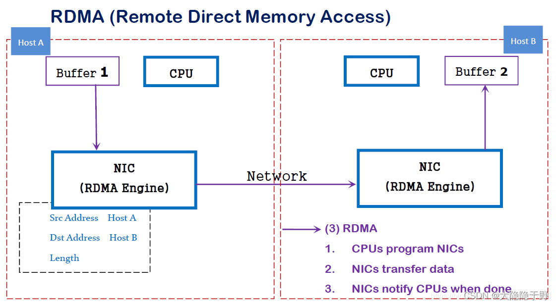 RDMA是一种概念,在两个或者多个计算机进行通讯的时候使用DMA, 从一个主机的内存直接访问另一个主机的内存。