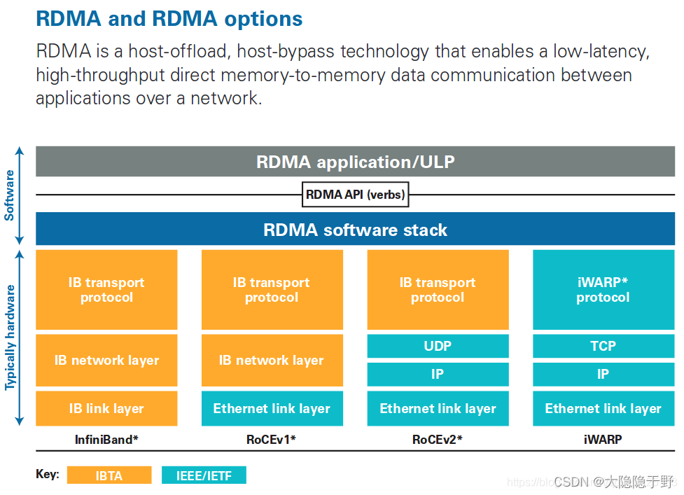 RDMA作为一种host-offload, host-bypass技术,使低延迟、高带宽的直接的内存到内存的数据通信成为了可能。目前支持RDMA的网络协议有: