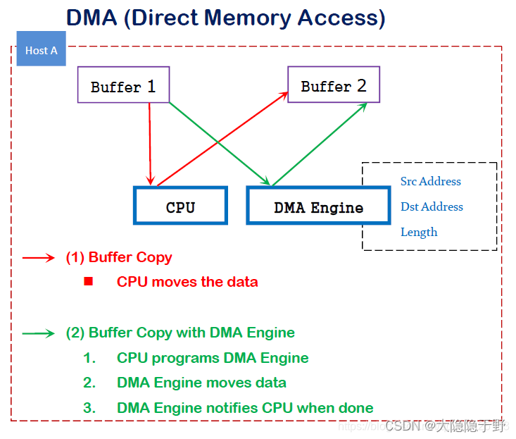 传统内存访问需要通过CPU进行数据copy来移动数据,通过CPU将内存中的Buffer1移动到Buffer2中。DMA模式:可以同DMA Engine之间通过硬件将数据从Buffer1移动到Buffer2,而不需要操作系统CPU的参与,大大降低了CPU Copy的开销。