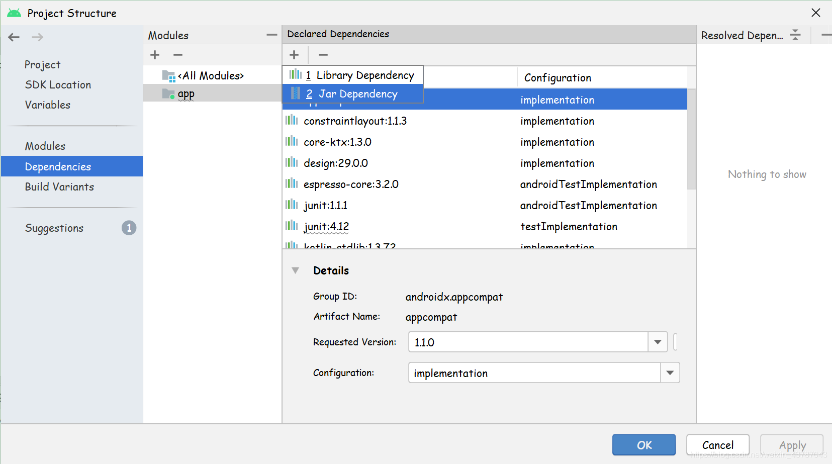 这个时候还不能使用jar包,因为项目不知道你导入了可以使用的东西。下面我们对项目添加对这个jar包的依赖,在 File -> ProjectStructure 中:dependency -> app -> + -> Jar Dependency。点击后找到lib下jar包的路径,加入