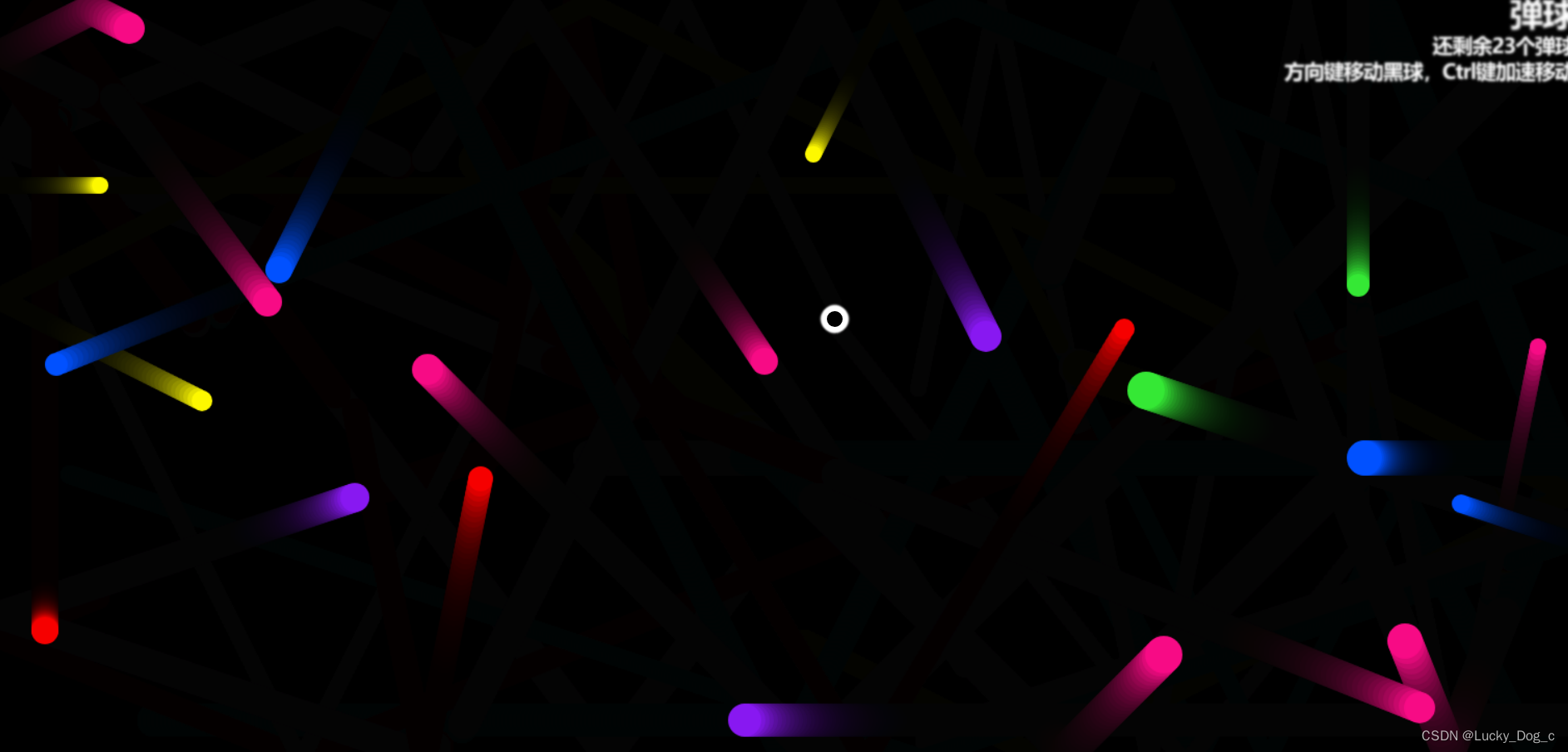 使用Canvas与原生javaScript创建的弹球小游戏通过键盘上下左右键控制小黑球移动,'吃掉'彩色弹球,彩色弹球相互碰撞交换颜色,按住Ctrl键可加速小黑球移动