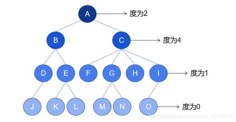 10. 节点的度:一个节点含有的子树(或子节点)的个数称为该节点的度。如下图中, 根节点 A 的度为2,节点 C 的度为4,节点 I 的度为1,节点 O 的度为 0 。