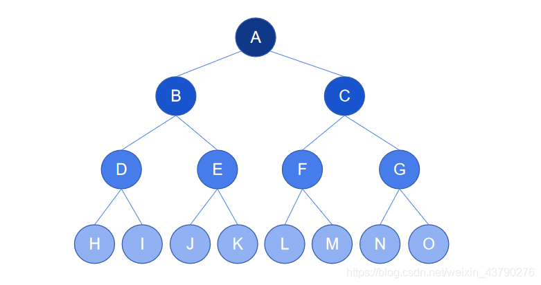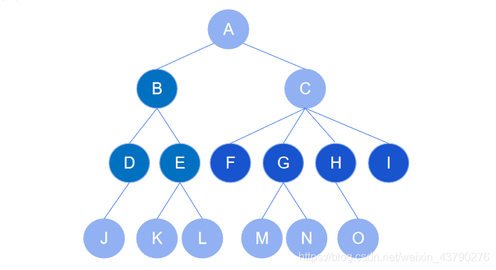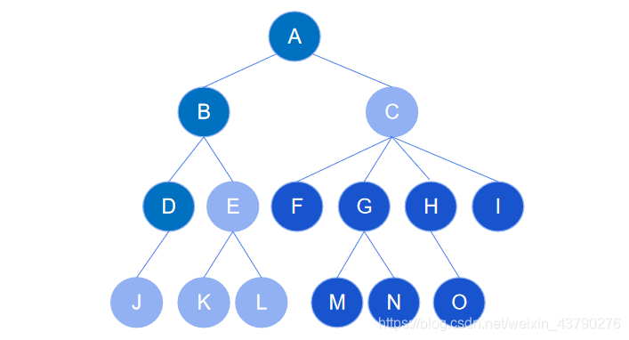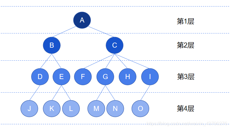 7. 节点的层次:从根开始定义起,根为第1层,根的子节点为第2层,以此类推。如下图中,根节点 A 在第1层,节点 M 在第4层。