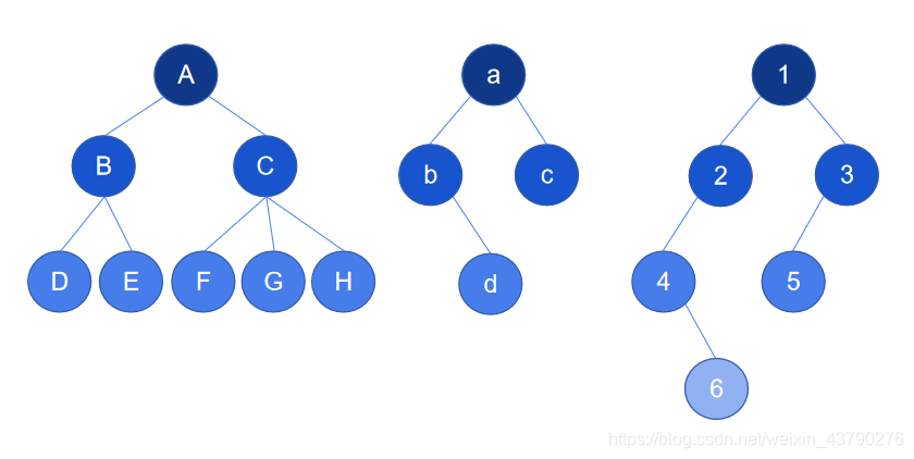 1. 二叉树:每个节点最多含有两个子树的树称为二叉树,如下图。二叉树是最常用的树结构,可以对二叉树进一步细分(另外的文章再仔细研究)。