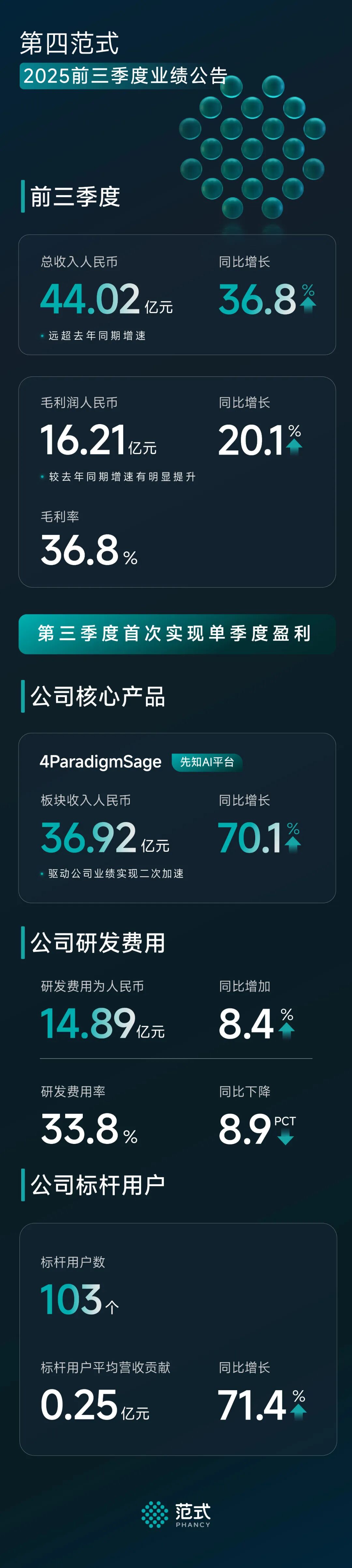 今天(11月12日),范式发布2025年前三季度业绩公告。公告显示,今年前三季度,公司总收入人民币44.02亿元,同比增长36.8%,远超去年同期增速;毛利润人民币16.21亿元,同比增长20.1%,较去年同期增速有明显提升;毛利率为36.8%,期间内总体保持平稳,特别值得一提的是,公司在第三季度首次实现单季度盈利。
